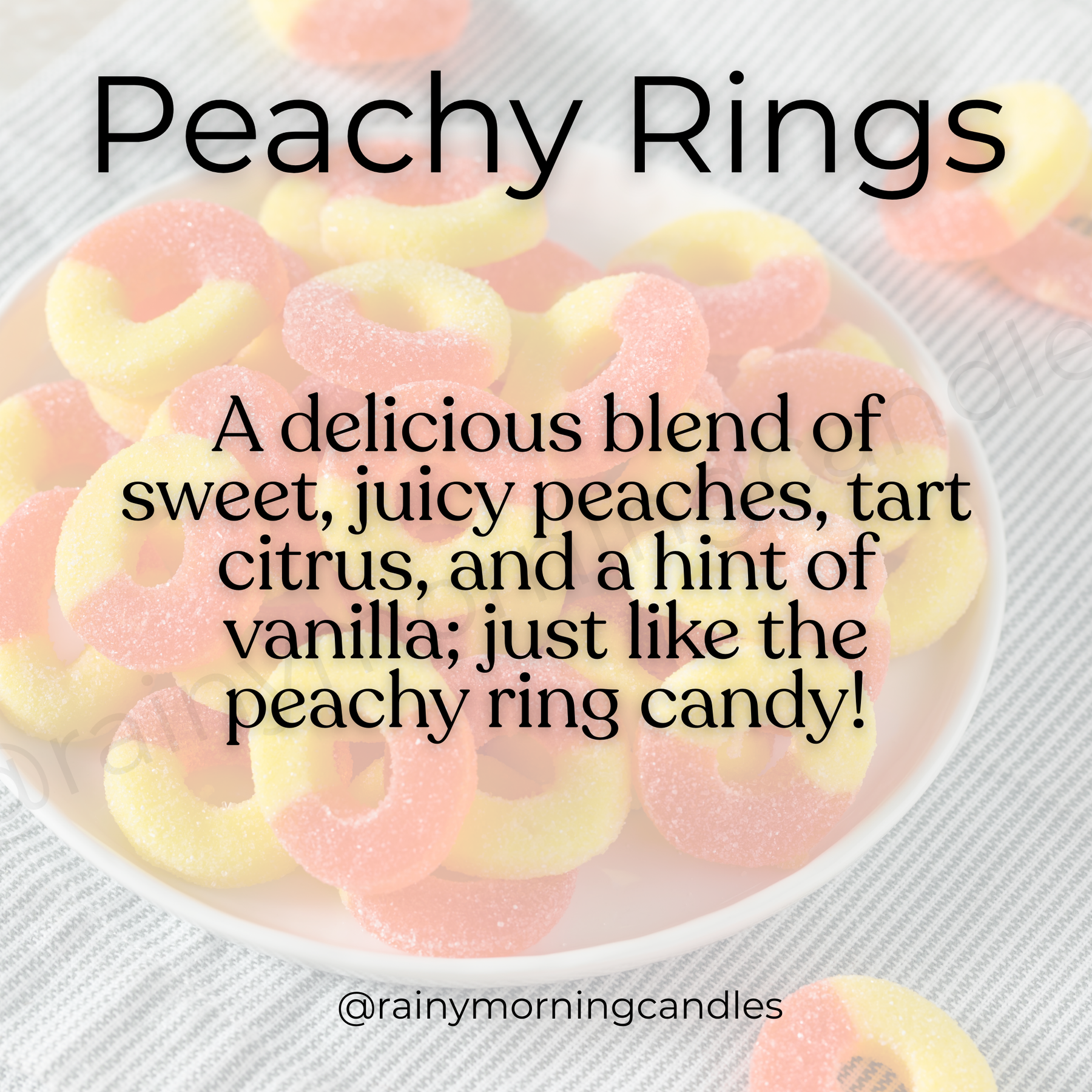 A delicious blend of sweet, juicy peaches, tart citrus, and a hint of vanilla; just like the peachy ring candy!